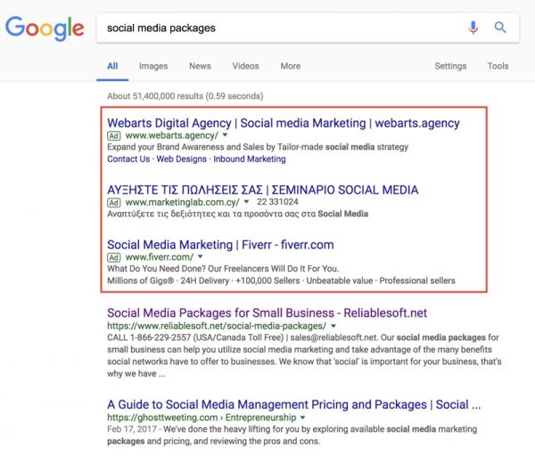 Nếu bạn tìm kiếm trên Google, bạn sẽ nhận thấy rằng bên trên và bên dưới kết quả không phải trả tiền sẽ hiển thị Quảng cáo trả tiền.
